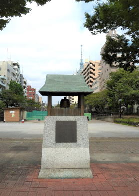 ![]() 両 国 物 語 津軽の太鼓・津軽家上屋敷跡 8 南割下水に面した弘前藩主・津軽越中守の上屋敷には、火の見櫓がありました。通常、火の見櫓で火災を 知らせる時は板木を鳴らしますが、この櫓には板木の代わりに太鼓が下がっていて、その太鼓で火事を知 らせていました。なぜ、この屋敷の櫓だけに太鼓が許されていたのか誰も知らず、不思議なこととされて いました。これが本所七不思議の一つ「津軽の太鼓」の話です。七不思議とはいいますが、伝説などの伝 わり方によって話もまちまちで、話の数も七つと決まったわけではありません。この「津軽の太鼓」には 「越中守屋敷の火の見櫓の板木を鳴らすと、奇妙なことに太鼓の音がする」という話も伝えられています。 墨 田 区 |