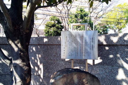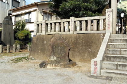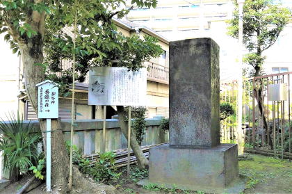 ![]() 《墨田区登録文化財》 吾 嬬 の 森 碑 所在地 墨田区立花一丁目一番十五号 吾嬬神社内 この碑は、明三年(一七六六)に儒学者山県大貳により建立された と伝わります。「吾嬬の森」とは、吾嬬神社の代表的な呼び名で、江戸を代表する 神社の森のひとつとして「葛西志」や「江戸名所図会」にも紹介されています。 碑の内容は、地元に伝わる神社の来歴となっており、日本武尊の 東征、尊の妃・弟橘媛の入水により海神の怒りを鎮めたこと、 人々がこの神社の地を媛の墓所として伝承し、大切に残してきたことなどが刻まれて います。「新編武蔵風土記稿」には、碑は神木の傍らに建てられていたと記されています。 神木とは、墨田区登録文化財である「連理の樟」のことです。一つの根から 二つの幹を見せる姿は、歌川広重の「江戸名所百景」にも描かれています。左の絵は 広重の作品「江戸名所道化盡吾嬬の森梅見」で、中央にひときわ高く そびえるのが「連理の樟」です。明治四十三年(一九一○)の大水や関東大震災、 東京大空襲などにより森は失われましたが、長く地域に根ざした伝承は、この碑を 通じても垣間見ることができます。 平成二十一年三月 墨田区教育委員会 |