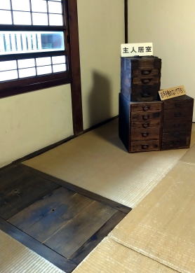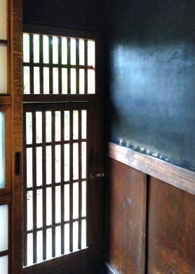 ![]() 黒い壁の下の部分に漆を混ぜて塗 った壁が光って見えます。 |