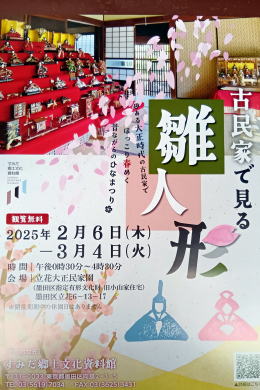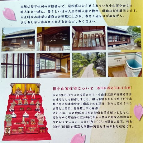 | 立花大正民家園旧小山家住宅の年間イベント 庭には七福神の像があり、わずか1分間で七福神めぐりができるスポットになっています。 3月3日のひなまつりにちなみ、毎年2月下旬から3月上旬まで小山家のひな人形を中心に展示します。 5月5日の端午の節句にちなみ、毎年4月下旬から5月上旬まで小山家の五月人形を展示します。 お問い合わせ・・・すみだ郷土文化資料館が担当しています。(電 話 / 03-5619-7034) |