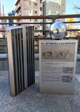 押上・業平橋駅周辺土地区画整理事業モニュメント 押上・業平橋駅周辺土地区画整理事業記念碑は、おしなり公園の 休憩広場にあります。これは、東京スカイツリー開業に合わせて 進められたこの地域の土地区画整理事業の完了を記念して建てら れたもので、UR都市機構が関与した事業の歴史と、江戸時代の風 情から現代の都市景観への変遷を示す重要なモニュメントです。 所在地: 墨田区押上1丁目1、おしなり公園内。 住 所 / 東京都墨田区押上1丁目 |
