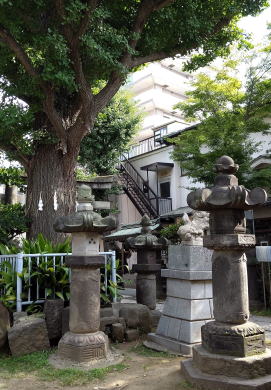 ![]() 常 泉 寺 慶長元(1596)年に牛島村の草創者の一人である高橋新右衛門が開基、弟の仙樹院日貞贈上人が 開山した日蓮正宗の寺院。江戸中期に六代将軍家宣公(在職1709~12)の御台所・天英院殿が帰依し、 寺料30石が給されるようになり繁栄。この時期に大伽藍を築き、境内には本行坊、本種坊、本住坊の 三つの塔頭があった。寛永6(1853)年には、島津斉彬公が十三代将軍家定公(在職1853~58)の御台所と なる養女、篤姫の輿入れ成就を祈願している。当時、隣地は水戸藩下屋敷で幕府からは葵御紋の使用 を許され、高い格式を誇っていた。篤姫は輿入れ直前に天英院殿の生家で境内に墓所もあった近衛家と 養子縁組しており、これが縁で落飾して天璋院殿となった後も篤い信仰を寄せている。昭和3(1928)年、 言問橋の完成に伴い、言問通りが境内の中央を横切ることになり、国は代替地を提案してきたが、 古刹としての歴史を重視し、寺域を縮小して現在地にとどまった。境内には江戸の儒学者で医者の 朝川善庵の墓やドイツなど海外で研究を重ね、日本で初の薬学博士となった尾張犬山藩士、 下山順一郎の記念碑などがある。 This Nichiren Shoshu Buddhist temple was established in 1596 by Takahashi Shinemon.one of the founders of Ushijima village.The first head priest was his brother Senjuin-Nichi/e-Zoshonin.The temple had many devotees among the Tokugawa Shogunate. including Teneiin.the wife of the 6th Shogun lenobu.and Atsuhime. The wife of the 13th Shogun lesada.