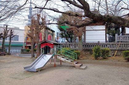 なる古川沿いに自然堤防となっていたと推定されます。江戸時代この辺は寺島新田と呼ば