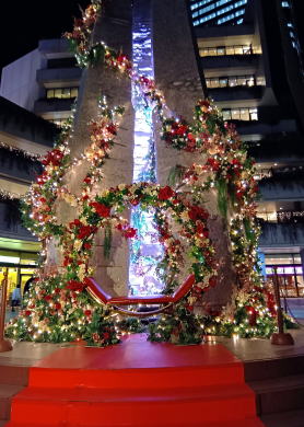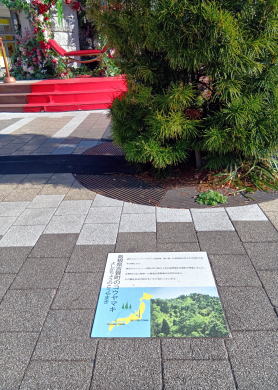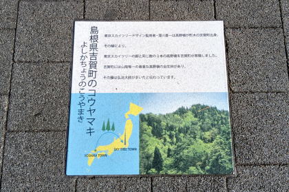 島根県吉賀町のコウヤマキ案内板 東京スカイツリーのデザイン監修者・彫刻家の澄川喜一氏は、 町木を高野槇(コウヤマキ)とする島根県吉賀町の出身です。 このご縁により吉賀町から、東京スカイツリーの脚の数と同じ 三本の高野槇が寄贈され、ここソラマチひろばに植えられました。 ふるさとの自然とスカイツリーを結ぶ、象徴的な記念樹です。 住 所 / 東京都墨田区押上1-1-2 (ソラマチひろば) |