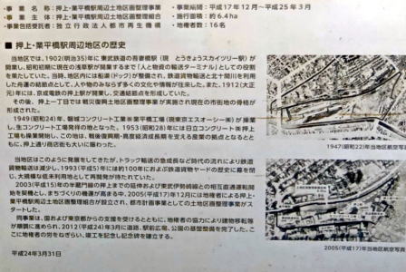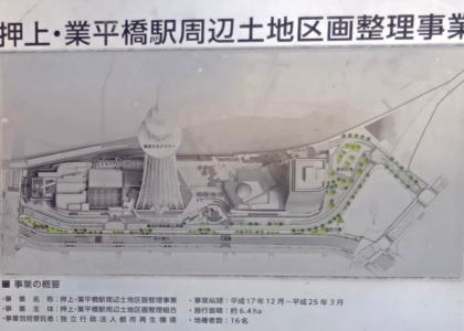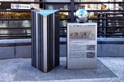 押上・業平橋駅周辺土地区画整理事業モニュメント 押上・業平橋駅周辺土地区画整理事業記念碑は、おしなり公園の 休憩広場にあります。これは、東京スカイツリー開業に合わせて 進められたこの地域の土地区画整理事業の完了を記念して建てら れたもので、UR都市機構が関与した事業の歴史と、江戸時代の風 情から現代の都市景観への変遷を示す重要なモニュメントです。 所在地: 墨田区押上1丁目1、おしなり公園内。 住 所 / 東京都墨田区押上1丁目 |