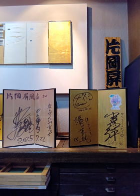 片 岡 屏 風 店 (屏風博物館) 屏風は古くは奈良時代から歴史があり、風を 防ぐという意味合いからなくてはならない 調度品として使われてきました。 東京で唯一の屏風専門店 住 所 / 東京都墨田区向島1-31-6 営業時間 / AM10:00~PM5:00 電 話 / 03-3622-4470 定 休 日/ 日・祝祭日 |