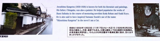 ![]() A multi-talented author and artist Residence of Awashima Kangetsu 淡 島 寒 月 旧 居 跡 父の淡島椿岳は江戸時代に大流行した軽焼きせんべいの名店「淡島屋」を経営する 実業家で大地主であった。また、知識欲が旺盛で、画を学び、ピアノを買って演奏会 を開く趣味人でもあった。明治17(1884)年、向島の弘福寺境内隠居所を建てて住んだ。 息子の寒月は西鶴再評価のきっかけをつくり、趣味人として、新聞や雑誌に寄稿。実 体験をベースにした小説や江戸にまつわる話などを洒脱なタッチで著し、好評を博した。 明治26(1893)年頃、父の使っていた隠居所を梵雲庵と名づけ隠居。「梵雲庵寒月」と 号し、悠々自適な生活に入る。夏目漱石の「吾輩は猫である」に水島寒月という学者が 登場するが、モデルは寺田虎彦で、名前は寒月から採ったといわれている。収集家と しても有名で、梵雲庵には三千余の玩具と江戸関連の貴重な資料があったが、関東 大震災ですべて焼失してしまった。
