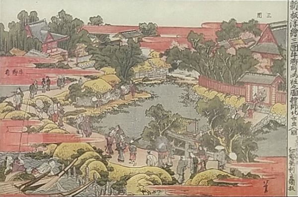 葛飾北斎案内板 ⑮ 新板浮絵 三囲牛御前両社之図 Shinpan Ukie Mimeguri Ushi no Gozenryousha no Zu 版元・伊勢屋利兵衛から板行された「新板浮絵」 の一枚です。文化(1804~18)中期、葛飾北斎50 歳頃の作品とされています。 住 所 / 東京都墨田区向島2ー1 |