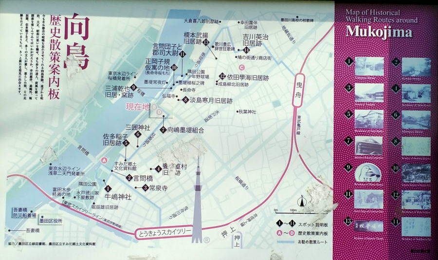 ![]() 隅田公園 散策解説版8 墨堤植桜之碑と桜勧進 住民が育てた墨堤の桜 “Shokuou-no-Hi”in Bokutei and “Sakura-Kanjin”-Cherry trees grown by local people 江戸時代、花見の名所としての地位を確立していった墨堤も、当初の墨堤の桜は水神社(現在の隅田川神社) 付近を中心に植えられました。しかし1800年代から、地元の村の有志らによって桜が植えられ、墨堤の 桜が南へと延伸して行きました。墨堤の桜が長命寺、三囲神社と徐々に延びて、枕橋まで達したのは1880年 ごろといわれています。この間は地元有志の植桜だけでなく、有志が発起人となった「桜勧進」と呼ばれる 寄付が行われています。墨堤の桜が地元の人々に愛されていた桜であることが、この植桜之碑に刻まれています Bokutei establ ished a reputation as a good place of cherry blossom viewing in Edo era. Those cherry trees had planted only around Suijin shrine (current Sumidagawa shrine). From 1800s, volunteers in local village planted many cherry trees along the river to the South. A row of cherry trees in Bokutei was gradually extended to “Chomei-ji temple” “Mimeguri shrine” and it reached “Makura Bridge” in about 1880. During the time, there was also a donation for planting cherry trees called “Sakura-Kanjin”promoted by those volunteers. It is curved on “Shokuou-no-Hi (monument)” that cherry trees in Bokutei were loved by local people. |