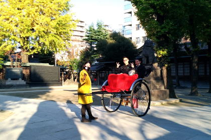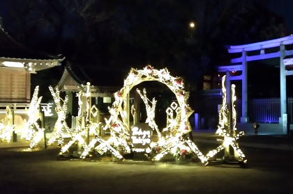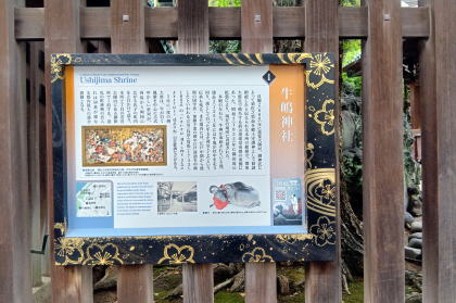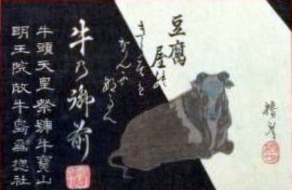 ![]() A shrine toSusano'o'the neighbourhood deity of Honjyo Ushijima Shrine 牛 嶋 神 社 貞観2(860)年に慈覚大師が、御神託によって須佐之男命を郷土守護神として勧請創祀 したと伝えられる本所の総鎮守。関東大震災で焼失する前は墨堤常夜燈の東側にあった。 昭7(1932)年に隅田堤の拡張により、現在の場所に再建された。本殿の左右に、神牛が奉納 されている他、建長3(1251)年には牛鬼が社中を走り回り、落として行った牛玉を神宝とした という伝承も残る。また境内には、江戸中期から後期の国学者・加藤千蔭のや碑や江戸落語 を中興したといわれる<立川(鳥亭)焉馬(1743~1822)の 「いそかすは 濡まし物と夕立の あとよりはるゝ 堪忍の虹」の句碑などがある。 5年に1度の例大祭は、牛が引く鳳輦を中心に古式床しい祭礼が向島から両国に広がる氏子の 町内を2日かけて巡り、本所2丁目の若宮公園内にある御旅で所一迫する。返礼の町神輿の 宮入れは50基が連なる都内最大の連合渡御となる。 This 1s the head shrine of the Honjo neigbbourhood, founded circa 860 AD by the great Buddhist leader Jikaku. Legend has it that in 1251 the shrine was visited by a bull demon which dropped a knot of hair as it ran arond the shrine, and the knot was enshrined as a sacred treasure. The legend is commemorated in the statues of cattle deity that flank the main shrine building