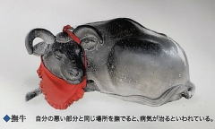 ![]() 〈墨 田 区 登 録 文 化 財〉 撫 牛 所在地 墨田区向島1丁目4番 牛嶋神社内 撫牛の風習は、江戸時代から知られていました。自分の体の悪い部分をなで、牛の同じ ところをなでると病気がなおるというものです。牛嶋神社の撫牛は体だけではなく、心 も治るというご利益があると信じられています。また、子どもが生まれたとき、よだれかけ を奉納し、これを子どもにかけると健康に成長するという言い伝えもあります。この牛の 像は、文政8年(1825)ごろ奉納されたといわれ、それ以前は牛型の自然石だったようです。 明治初期の作家、淡島寒月の句に 「なで牛の石は涼しき青葉かな」 と詠まれ、堀辰雄は『幼年時代』で、「どこかメランコリックな目なざしをした牛が 大へん好きだった」と記すように、いつも人々に愛されてきました。 |