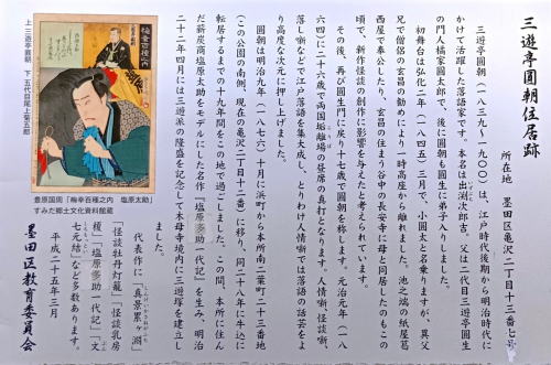 ![]() 三 遊 亭 圓 朝 住 居 跡 所在地 墨田区亀沢二丁目十三番七号 三遊亭圓朝(一八三九~一九〇〇)は、江戸時代後期から明治時代にかけて活躍 した落語家です。本名は出渕次郎吉。父は二代目三遊亭圓生の門人橘家 圓太郎で、後に圓朝も圓生に弟子入りしました。初舞台は弘化二年(一八四五) 三月で、小圓太と名乗りますが、異父兄で僧侶の玄昌の勧めにより一時高座から 離れました。池之端の紙屋葛西屋で奉公したり、玄昌の住まう谷中の長安寺に母と 同居したのもこの頃で、新作怪談の創作に影響を与えたと考えられています。 その後、再び圓生門に戻り十七歳で圓朝を称します。元治元年(一八六四)に 二十六歳で両国垢離場の昼席の真打となります。人情噺、怪談噺、落し噺 などで江戸落語を集大成し、とりわけ人情噺では落語の話芸をより高度な次元に 押し上げました。圓朝は明治九年(一八七六)十月に浜町から本所南二葉町二十三番地 (この公園の南側、現在の亀沢二丁目十二番)に移り、同二十八年に牛込に転居 するまでの十九年間をこの地で過ごしました。この間、本所に住んだ薪炭商塩原太助 をモデルにした名作『塩原多助一代記』を生み、明治二十二年四月には三遊派の隆盛 を記念して木母寺境内に三遊塚を建立しました。代表作に「真景累ヶ淵」 「怪談牡丹灯籠」「怪談乳房榎」「塩原多助一代記」「文七元結」など 多数あります。 平成二十五年三月 墨田区教育委員会」 |