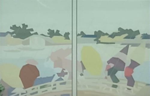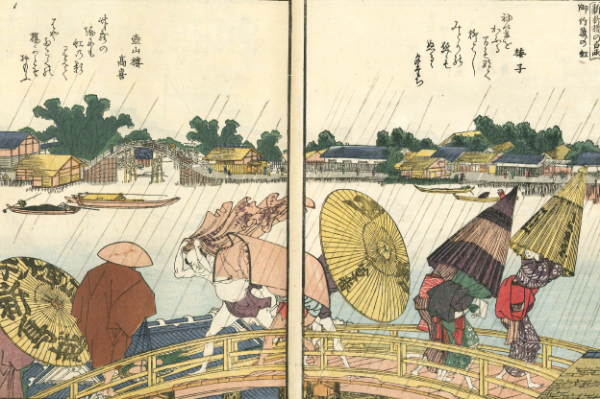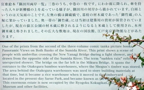 ![]() ![]() ![]() 新柳橋の白雨御竹蔵の虹 ー絵本隅田川両岸一覧━ 狂歌絵本『隅田川両岸一覧』三巻のうち、中巻の一枚です。にわか雨に降られ、傘を持った 人々が新柳橋の上を走っている様子が、隅田川の対岸から描かれています。白雨というのは 天気雨のことです。左奥の橋は御蔵橋で、幕府の材木蔵であった「御竹蔵の入堀に架かって いました。奥一帯の「御竹蔵」には当初は建築用の資材が保管されていましたが、現在の猿江 公園の材木蔵に移されるようになると米蔵として使用され、本所御米蔵と称されました。 その広大な敷地は、現在の国技館、江戸東京博物館などがあたります One of the prints from the second of thethree-volume comic tanka picture books. Panoramic Views on Both Banks of the Sumida River. This print shows a second of people with umbrellas crossing theNew Yanagi Bridge during a light shower, and it is drawn from the opposite side of the Sumida River. The term “sudden rain” refers to an unexpected shower. The bridge on the far left is the Mikura Bridge. It spans theentrance to the Otakegura bambo warehouses,where the Shogun's timber was stored. The area behind the Otakegura warehouses was used to stor building materials at that time, but it became a rice warehouse when it moved to the timberyard located in the present-day Sarue Park, and became known as the Honjo Rice Warehouse. This enormous estate is now occupied by the Ryogoku Kokugikan, he Edo Tokyo Museum and other facilities. |