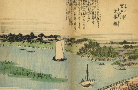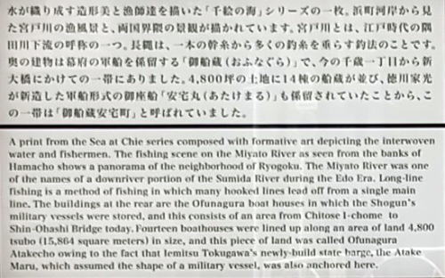 ![]() ![]() ![]() 宮戸川長縄━千絵の海━ 水が織り成す造形美と漁師たちを描いた「千絵の海」シリーズの一枚。浜町河岸から見た 宮戸川の漁風景と、両国界隈の景観が描かれています。宮戸川とは、江戸時代の隅田川 下流の呼称の一つ。長縄は、一本の幹糸から多くの釣糸を垂らす釣法のことです。奥の 建物は幕府の軍船を係留する「御船蔵」で、今の千歳一丁目から新大橋に かけての一帯にありました。4800坪の土地に14棟の船蔵が並び、徳川家光が新造した 軍船形式の御座船「安宅丸」も係留されていたことから、この一帯は 「御船蔵安宅町」と呼ばれていました。 A print from the Sea at Chie series composed with formative art depicting the interwoven water and fishermen. The fishing scene on the Miyato River as seen from the banks of Hamacho shows a Panorama of the neighborhood of Ryogoku.The Miyato River was one of the names of a downriver portion of the Sumida River during the Edo Era.Long-line fishing is a method of fishing in which many hooked lines lead off from a single main line. The building at the rear are the Ofunagura boathouses in which the Shogun's military vessels were stored, and this consists of an area from Chitose 1-chome to Shin-Ohashi Bridge today. Fourteen boart houses were lined up along an area of land 4,800 tsubo(15,864 square meters) in size, and this piece of land was called Ofunagura Atakecho owing to the fact that lemitsu Tokugawa's newly-build state barge, the Atake Maru, which assumed the shape of a military vessel, was also anchored here. |