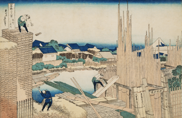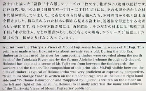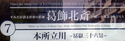 ![]() ![]() ![]() 本 所 立 川 ━富嶽三十六景━ 富士山を描いた「富嶽三十六景」シリーズの一枚です。北斎が70歳頃の版行です。 江戸時代、堅川の北側(旧相生町一丁目~二丁目付近)には、その水運を活かした 材木問屋が密集していました。北斎はそれら問屋と職人たち、木材の間から覗く 富士山を描きました。積み重ねられた材木の間から見える富士は、遠近法を得意 とする北斎らしい構図です。右下の材木置き場には「西村置場」、その左右の材木 には「馬喰丁弐丁目」「永寿堂仕入」などの墨書きがあり、版元名とその場所、 本シリーズ(「富嶽三十六景」)の宣伝がさりげなく入っています。 A print from the Thirty-six Views of Mount Fuji series featuring scenes of Mt.Fuji. This print was made whenHokusai was about seventy years old. During the Edo Era. timberyards that used the river for transporting timber were crowed along the north bank of the Tatekawa River (nearby the former Aioicho 1-chome through to 2-chome). Hokusai has depicted a scene of Mt .Fuji seen from between the timberyards, the workers and the timber.The composition of this print with Mt.Fuji visible between the piles of timber is typical of Hokusai, who was very proficient at expressing perspective. “Nishimura Storage Yard”is written on the timber storage area at the bottom right-hand side amd “2-Chome Bakurocho”and“Supplied by Eijudo”is written on the timber on the left and right of this, enabling Hokusai to casually advertisethe name and address f the Thirty-six Views of Mount Fuji series' publisher. |