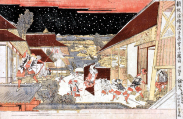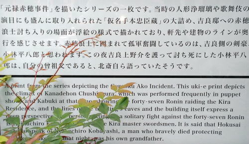 葛飾北斎⑥ 新板浮絵忠臣蔵 第 十 一 段 目 Shinban Ukie Chushingura : Dai Juichi-Danme (Newly Published Perspective Pictures of Chushingura:Act 11) 元禄赤穂事件」を描いたシリーズの一枚です。吉良邸への 赤穂浪士討ち入りの場面が浮絵の様式で描かれております。 住 所 / 東京都墨田区両国3ー13(本所松坂町公園) |
