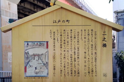 江 戸 の 町 二 之 橋 万治二年(一六五九)、堅川が開削されると五つの橋が 架けられ、隅田川に近い方から一之橋から五之橋と 名付けられました。その二ツ目の橋で、長さ10間 (18メートル)、幅三3間(5.4メートル)ほどありました。 波正太郎の「鬼平犯科帳」では、二之橋は「二ツ目 橋」という名で数多く登場します。 所 在 / 東京都墨田区両国4-1-12 |