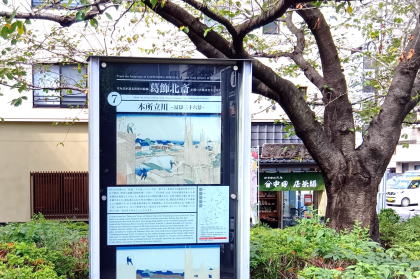 ![]() 絵 画 と 文 学 Site of former residence of Nakajima Ise 鏡 師 中 島 伊 勢 住 居 跡 中島伊勢の住居は、赤穂事件の後、町人に払い下げられ、本所松坂町となったこの辺り にありました。伊勢は、幕府御用達の鏡師で、宝暦十三年(一七六三)、後に葛飾北斎となる 時太郎を養子とします。北斎の出生には不明な点が多く、はっきりとしたことは判りません。 中島家はこの養子縁組を破綻にし、実子に家督を譲りますが北斎はその後も中島姓を名乗って いることから、中島伊勢の妾腹の子だったという説もあります。飯島虚心の『葛飾北斎伝 によると、北斎の母親は赤穂事件に登場する吉良方の剣客、小林平八郎の娘で、 鏡師中島伊勢に嫁いでいるとしています。この話は、北斎自身が広めたようです。 |
