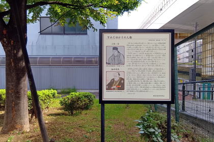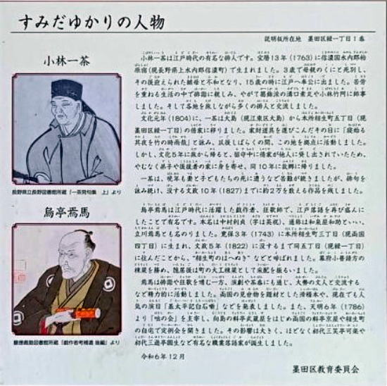 すみだゆかりの人物案内板 文化元年(1804)に、本所相生町五丁目(現墨田区緑一丁目) の借家に住んだ江戸時代の有名な俳人小林一茶と 江戸時代に活躍した戯作者、狂歌師で、江戸落語を再び 盛んにしたことで有名な烏亭焉馬 住 所 / 東京都墨田区緑1-1 |