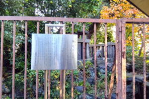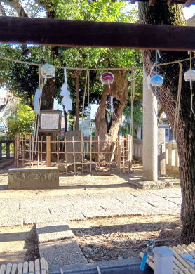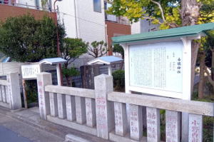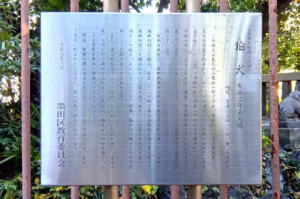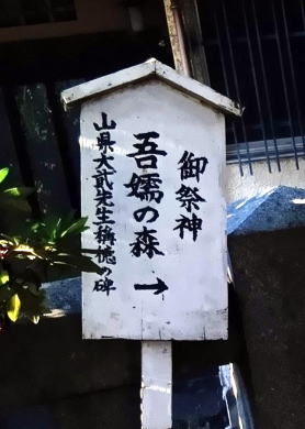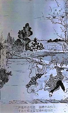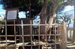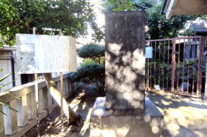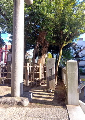 ![]() ![]() 《墨田区登録文化財》 吾 嬬 の 森 碑(あずまのもりひ) 所在地 墨田区立花一丁 目一番十五号 吾嬬神社内 この碑は、明三年(一七六六)に儒学 者山県大貳(やまがたたいに)により建 立されたと伝わります。「吾嬬の森」 とは、吾嬬神社の代表的な呼び名で、 江戸を代表する神社の森のひとつとし て「葛西志」や「江戸名所図会」にも 紹介されています。碑の内容は、地元 に伝わる神社の来歴となっており、日 本武尊(やまとたけるのみこと)の東征 、尊の妃・弟橘媛(おとうとたちばな ひめ)の入水(じゅすい)により海神の怒 りを鎮めたこと、人々がこの神社の地 を媛の墓所として伝承し、大切に残し てきたことなどが刻まれています。「 新編武蔵風土記稿」には、碑は神木の 傍らに建てられていたと記されていま す。神木とは、墨田区登録文化財であ る「連理(れんり)の樟(くす)」のこと です。一つの根から二つの幹を見せる は、歌川広重の「江戸名所百景」にも 描かれています。左の絵は広重の作品 「江戸名所道化盡(どうけづくし) 吾 嬬の森梅見」で、中央にひときわ高く そびえるのが「連理の樟」です。明治 四十三年(一九一❍)の大水や関東大 震災、東京大空襲などにより森は失わ れましたが、長く地域に根ざした伝承 は、この碑を通じても垣間見ることが できます。 平成二十一年三月 墨田区教育委員会 |