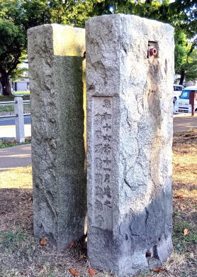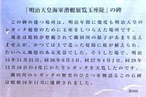 隅田川聖蹟記念碑碑文 國府屋東氏 中村素道氏謹撰 ![]() 恭シク惟ミルニ 明治天皇夙ニ 叡慮ヲ帝國海軍ノ發達 ニ勞シ給ヒ明治元年三月親シク大阪ニ 幸シテ諸艦ヲ天保山ニ閲セラン爾來屢 艦船部隊官衙學校等ニ行幸アラセ給ヘ リ殊ニ海軍短艇競漕ノ墨田川ニ行ハル ルヤ 玉座ハ設ケテ此ニ在リ親シク 天覧ヲ賜フコト前後四次ニ及ベリ明治 十五年ニハ十一月二十一日二十六年ニ ハ六月三日二十七年ニハ四月二日ニ臨 御アラセラレ是ノ日皇后亦行啓セラレ 二十九年ニハ十二月十八日ヲ以テ親閲 アラセ給ヘリ其ノ間二十五年ニハ六月 十九日ヲ以テ皇后竝 皇太子ノ行啓ヲ 辱ウセリ参加ノ将士齊シク恐懼感激シ テ踴躍技ヲ競ヒ行事最モ盛大ヲ極ハメ リ斯ノ如キハ皆是レ宸慮ノ深キニ出デ 帝國海軍ノ無上ナル光榮トシテ牢記ス ベキ所ナリ只恐ル當年玉座ノ 聖蹟星 移リ物替ハリテ滄桑ノ變ヲ経或ハ湮晦 ニ歸センコトヲ是レ本會ガ天皇親臨ノ 此ノ尊ブベキノ地ヲ永遠ニ顕彰ン奉リ 永ク 聖徳ノ至大ナルヲ仰ガンコトヲ 期シ帝國海軍及朝野ノ諸彦ト謀リテ 昭和十六年ノ 明治節日ヲ卜シ一碑 ヲ玉座ノ阯ニ建ツル所以ナリ乃テ謹ミ テ事ノ由來ヲ勒シ之ヲ不朽ニ傳フ 紀元二千六百一年十一月三日 隅田川聖蹟顕彰會 ![]() 「明治天皇海軍漕艇展覧玉座碑」 この碑の建つ場所は、明治年間に幾 度も明治天皇のレガッタ視察のため に玉座をしつらえた場所です。現在 は堤防が整備されて隅田川の様子が あまり見えませんが、かつては土で 造った堤防に桜が植えられ、たいへ ん風情のある光景でした。そうした 場で、明治15年11月21日、同26年6 月3日、同27年4月2日、同29年12月 18日の4度にわたりレガッタを天覧 したのです。隅田川のレガッタの歴 のひとつを物語るこの石碑は昭和16 年11月に建碑されました。 |