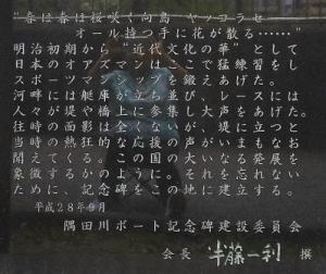 ![]() ![]() ![]() 漕 日本のボートは ここ隅田川を中心に 発展し その隆盛を迎えた Rowing in Japan was Nurtured here on the Sumida River, which then became its primary venue. “春は春は桜咲く向島 ヤッコラセー オール持つ手に花が散る・・・・・・ ”明治初期から”近代文化の華”とし て日本のオアズマンはここで猛訓練を しスポーツマンシップを鍛えあげた。 河畔には艇庫が立ち並び、レースには 人々が堤や橋上に参集し大声をあげた 。往時の面影は全くないが、堤に立つ と当時の熱狂的な応援の声がいまもな お聞こえてくる。この国の大いなる発 展を象徴するかのように。 それを忘れないために、記念碑をこの 地に建立する。 平成28年9月 隅田川ボート記念碑建設委員会 会長 半藤一利 撰 隅田川ボート年表 ![]() |