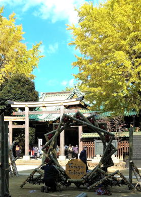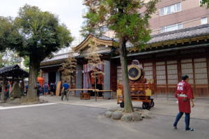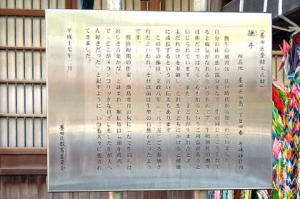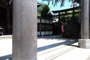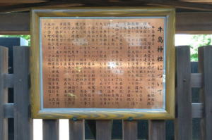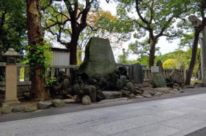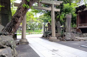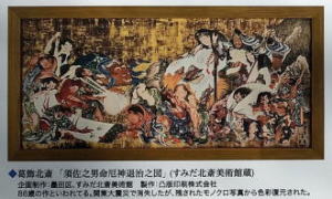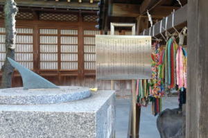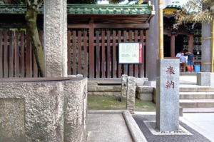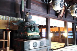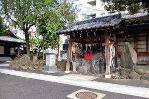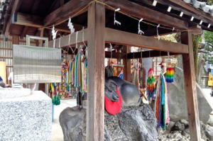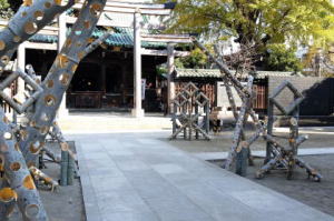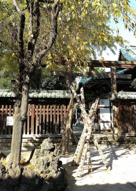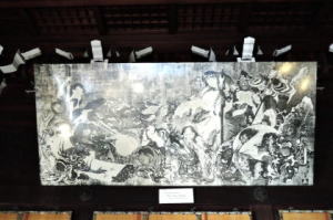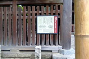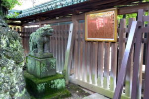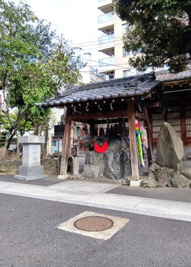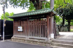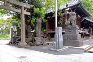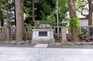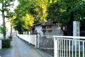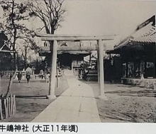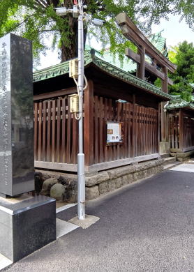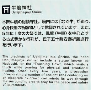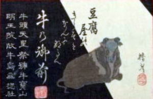 ![]() A shrine toSusano'o'the neighbourhood deity of Honjyo Ushijima Shrine 牛 嶋 神 社 貞観2(860)年に慈覚大師が、御神託 によって須佐之男命を郷土守護神と して勧請創祀したと伝えられる 本所の総鎮守。関東大震災で焼失す る前は墨堤常夜燈の東側にあっ た。昭7(1932)年に隅田堤の拡張 により、現在の場所に再建された。 本殿の左右に、神牛が奉納されて いる他、建長3(1251)年には牛鬼が社 中を走り回り、落として行った牛玉 を神宝としたという伝承も残る。ま た境内には、江戸中期から後期の 国学者・加藤千蔭の碑や江戸落語を 中興したといわれる<立川(鳥亭)焉馬(1743~1822)の 「いそかすは 濡まし物と夕立の あとよりはるゝ 堪忍の虹」 の句碑などがある。 5年に1度の例大祭は、牛が引く鳳輦 を中心に古式床しい祭礼が向島から 両国に広がる氏子の町内を2日かけ て巡り、本所2丁目の若宮公園内に ある御旅で所一迫する。返礼の町 神輿の宮入れは50基が連なる都内 最大の連合渡御となる。 This 1s the head shrine of the Honjo neigbbourhood, founded circa 860 AD by the great Buddhist leader Jikaku. Legend has it that in 1251 the shrine was visited by a bull demon which dropped a knot of hair as it ran arond the shrine, and the knot was enshrined as asacred treasure. The legend is commemorated in the statues of cattle deity that flank the main shrine building ![]() 牛嶋神社大正11年頃 ![]() 葛飾北斎「須佐之男命厄神退治」 86歳の作といわれている。関東 大震災で消失したが、モノクロ が写真に残っている。 ![]() ◆撫 牛 自分の悪い部分と同じ場所 を撫でると、病気が治ると いわれている。 |