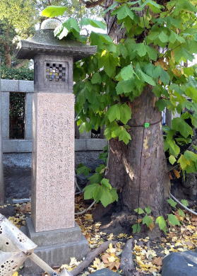 ![]() < 墨田区登録文化財 > 烏亭焉馬『いそかすは』の狂歌碑 所在 墨田区向島一丁目四番五号 牛嶋神社内 「“いそかすは 濡れまし物と 夕立の あとよりはるゝ 堪忍の虹」 談洲楼烏亭焉馬 この狂歌碑は裏面にあるとおり、初 烏亭焉馬自身が文化七年(一八一〇 )に建てた碑です。江戸落語中興の 祖と称された烏亭焉馬は本名中村利 貞、字は英祝、通称は和泉屋和助 です。寛保三年(一七四三)生れ、 本所相生町五丁目(現緑一丁目)の 大工の棟梁で、狂歌や戯文をよくす る文化人としても有名でした。談洲 楼の号は五世市川団十郎と義兄弟の 契りを結んことから団十郎をもじっ たもの、また竪川に住むことから立 川焉馬、職業が大工であることから 「鑿釿言墨曲尺(のみておのげんす みかねじゃく)」とも号しました。 元禄時代にひとつの話芸として確 立された落語も、その後衰えてい またが、天明四年(一七八四)に 向島の料亭武蔵屋において、焉馬 が自作自演の「噺(はなし)の会」 を催し、好評を得たことから江戸 落語が盛んになっていきました。 寛政末年頃には現在の落噺の形が 完成し、明治に入って落語という 呼び方が定着しました。文政五年 (一八二二)八0歳で亡くなり、 本所の最勝寺に葬られました。 (現在は寺・墓 共に江戸川区 平井に移転) 平成七年三月 墨田区 |