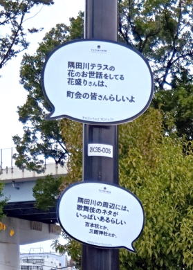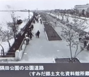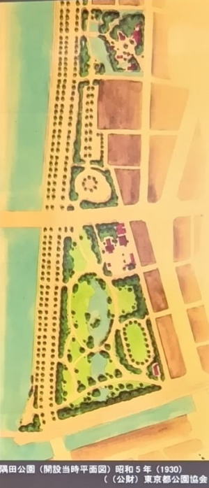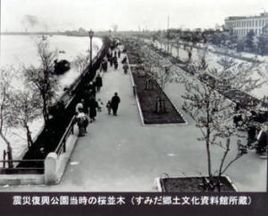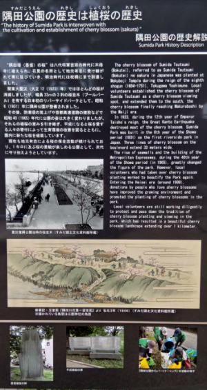 | 隅田公園の歴史は植桜の歴史 “The history of Sumida Park is interwoven with the cultivation and establishment of cherry blossom (sakura)” 隅田公園の歴史解説 Sumida Park History Description “隅田堤(墨堤)の桜”は八代将軍吉宗の時 代に木母寺に植えられ、花見の名所と して地元有志に受け継がれて南に延び ていき、明治時代には枕橋にまで到達 しました。関東大震災(大正12(1923)年) ではほとんどの桜が消滅しましたが、 幅員33mの3列の桜並木(ブールバー ル)を有する日本初のリバーサイドパー クとして、昭和6(1931)年に隅田公園が 整備されました。その後、防潮堤の嵩 上げや首都高速道路の建設などで 昭和40(1965)年代に公園の姿は大きく 変わりましたが、それらの植桜の営み を引き継ぎ、平成になると桜を愛す る人々の寄付によって生育環境の改善 を図るとともに、園内に新たな桜を植 栽しています。現在も地元有志による 桜の保全活動が続けられており、1キロ に及ぶ桜の景観が楽しめる公園として 、次代に守り伝えようとしています。 ![]() ![]() ![]() |