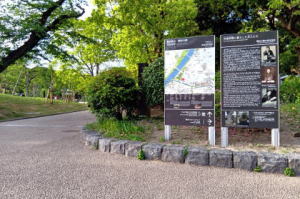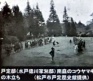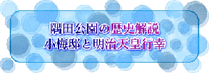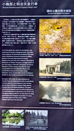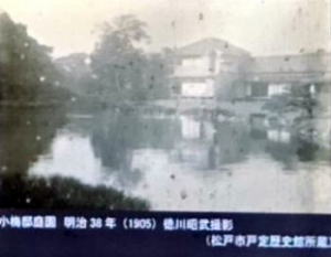 | 小梅邸と明治天皇行幸 “Koume Residence and Emperor Meiji’s Visit” 隅田公園の歴史解説 Sumda Park History Description 江戸時代、この地は水戸徳川家の蔵 屋敷で、上屋敷の小石川邸 (その外庭が小石川後楽園)が明治時 代初めに砲兵工〇となったため、 この小梅邸が本邸 (当主・徳川昭武: 15代将軍慶喜の弟)となりました。 小梅邸は、北十間川から隅田川に出 る舟運の要衝であると同時に、水戸 と小石川邸を結ぶ水戸街道沿いにあ って街道の要衝でもありました。 江戸時代から桜の名所であった隅田 堤の桜が満開の明治8年 (1875 )4月4 日、明治天皇が小梅邸に行幸され、 その時の御製が石碑に刻ま れています。これは徳川関係屋 が造られました。 In the Edo period, this used to be he daimyo’s city storehouse of the Mito-Tokugawa family. Since their main residence, the Koishikawa Residence (The outercourt is Koishikawa Korakuen), became an artillery arsenal in the early Meiji period, the Koume Residence became their main residence(The head of the 15th shogun, Yoshinobu Tokugawa).The Koume Residence as well as being a key point for water transportation from the Kitajukken River to the Sumida River, because of its location along Mitokaido, which connects Mito and the Koishikawa Residence, also served as a key point for the highway. On April 4, 1875, when the cherry blossoms of Sumida Tsutsumi (embankment of the Sumida River), a famous place for cherry blossoms sinc the Edo Period were in full bloom, Emperor Meiji made an imperial visit to the Koume Residence. The poem written by the Emperor upon his visit i engraved on the ston monument. It was the first visit made to the Tokugawa-related residence. It is also where the Meiji government and Tokugawa reconciled. Five more isits were made since then and in 1896, a Western-style house was also built. ![]() 「徳川邸行幸」明治8年(1875)4月4日 木村武山 昭和5年 (1930) 12月 (聖徳記念絵画館所蔵) ![]() 小梅邸西洋館 明治33年(1900) (松戸市戸定歴史館所蔵)” ![]() 小梅邸庭園 明治38年 (1905) 徳川昭武撮影 (松戸市戸定歴史館所蔵) ![]() 小石川後楽園 (水戸徳川家旧本邸) ![]() 水戸定邸(水戸徳川家別邸) 南庭のコウヤマキの木立ち (松戸市戸定歴史館所蔵) |
