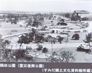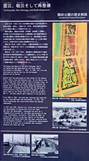 ![]() ![]() 震災、戦災そして再整備 “Earthquake, War Damage, and Redevelopment” 隅田公園の歴史解説 Sumida Park History Descnption 大正12年 (1923) 9月1日の関東大震災 で水戸徳川家の小梅邸は崩壊・焼失 し、昭和5年 (1930)、跡地は震災復興 局によって隅田公園として整備されま した。隅田公園は、隅田川の両岸 (本 所側・浅草側) に展開し、本所側には 三列の桜並木をもつ公園道路と旧小梅 邸の園池を取り囲む園路と広場等が整 備されました。震災復興を代表する隅 田公園も第二次世界大戦の東京大空襲 によって焼け野原になり、大勢の方が この地に仮埋葬されました。昭和33~ 36年 (1958~1961)、には公園道路上 に首都高速道路が造られました。昭和 52,3年 (1977, 1978)、東京都から移管 を受けた墨田区は区制30周年記念事業 として公園改修をし、さらに今回 (平 成30年~令和2年) (2018~2020) は小 梅邸や震災復興公園の遺構を保存・活 用しながら、浅草と東京スカイツリー を繋ぐ回廊の拠点として再整備されま した。 The Koume Residence of the Mito-Tokugawa family collapsed and was destroyed by the Great Kanto Earthquake on September 1, 1923. In 1930, the site was developed as Sumida Park by the Earthquake Reconstruction Bureau. Sumida Park was developed on both banks of the Sumida River (Honjo side and Asakusa side ). On the Honjo saide, a park road with three rows of cherry blossom trees, as well as a garden path and open space surrounding the garden and a pond of the former Koume Residence were constructed. Although Sumida Park was the epitome of reconstruction from the earthquake disaster, it was burnt down by the Great Tokyo Air Raids during World War 11, and many people were temporaril buried here From 1958 to 1961, the park was restored and repaired by the Tokyo Metropolitan Government. In 1971, the Shuto Expressway was constructed above the Sumidaembankment. In 1977 and 1978, Sumida City, which was entrusted with the development of Sumida Park from the Tokyo Metropolitan Government, renovated the park as a commemorative project for the 30th anniversary of the city. Furthermore, currently, from 2018 to 2020, by preserving and utilizing the remains of the koume Residence and Sumida Park that had been restored after the earthquake disaster, it is undergoing redevelopment to serve as a base for a promenade that connects Asakusa and Tokyo Sky Tree ![]() ![]() |