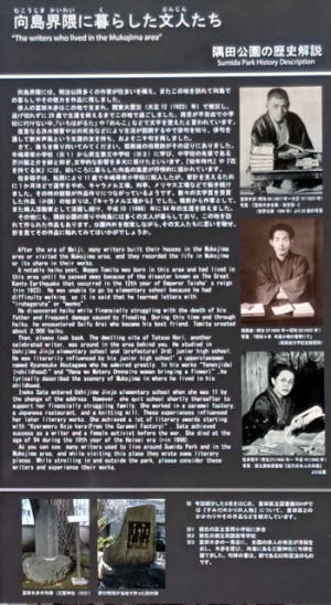 | 向島界隈に暮らした文人たち “The writers who lived in the Mukoujima area” 隅田公園の歴史解説 Sumida Park History Descnption 向島界隈には、明治以降多くの作家が 住まいを構え、またこの地を訪れて向 島での暮らしやその魅力を作品に残し ました。 俳人の富田木歩はこの地で生 まれ、関東大震災(大正12(1923)年)で被 災し、逃げ切れずに26歳で生涯を終える までこの地で過ごしました。両足が不 自由で小学校に行けない中、「いろはが るた」や「めんこ」などで文字を覚えた と言われています。 度重なる洪水被害や父の死去などによ り生活が困窮する中で俳句を知り、俳句 を通して新井清風という生涯の友を持 、およそ二千句を残しました。 さて、後ろを振り向いてみてください。 堀辰雄の旧居跡がその辺りにありまし た。牛嶋尋常小学校(※1)から府立第三 中学校(※2)に学び、中学校の先輩である 芥川龍之介を師と仰ぎ、文学的な影響を 多大に受けたといいます。『幼年時代』 や『花を持てる女』には、幼いころに暮 した向島の風景が抒情的に描かれていま す。佐多稲子は、転居により11歳で牛嶋 尋常小学校に転入したが、家計を支える ために1か月ほどで通学をやめ、キャラ メル工場、料亭、メリヤス工場などで働 き続けました。その時の経験が作品作り につながっているようです。数々の文学 賞を受賞した作品(小説)の始まりは、 『キャラメル工場から』でした。戦前か ら作家として、また婦人活動家として活 躍し続け、平成10(1998)年に94年の生涯 を終えました。その他にも、隅田公園の 周りや向島には多くの文人が暮らしてお り、この地を訪 れて作られた作品もあり す。公園内外を散策しながら、その文人 たちに思いを馳せ、折を見てその作品に 触れてみてはいかがでしょうか。 After the era of Meiji, many writers built their houses in the Mukojima area or visited the Mukojima area,and they recorded the life in Mukojima or its charm in their works. A notable haiku poet, Moppo Tomita was born in this area and had lived in this area until he passed away because of the disaster known as The Great Kanto Earthquake that occurred in the 12th year of Emperor Taisho‘sreign (=in 1923). He was unable to go to ementary school because he had difficulty waking, so it is said that he learned letters with “irohagaruta” or “menko” He discovered haiku while financially struggling with the death of his father and frequent damage caused by flooding During this time and through haiku, he encountered Seifu Arai who became his best friend. Tomita createdabout 2,000 haiku. Then, please look back. The dwelling site of Tatsuo Hori, another celebrated writer was around in the area behind you. He studied in Ushijima Jinjo elementary school and (prefectural 3rd) junjor high school. He was literarily influenced by his junior high school‘ s upperclassman named Ryunosuke Akutagawa who he admired greatly. In his works “Yonenjidai(=childhood)” and “Hana wo Moteru Onnna(=a woman bringing a flower)”.he lyrically described the scenery of Mukojima in where he lived in his childhood. Ineko Sata entered Ushijima Jinjo elementary school when she was 11 by the change of the address. However, she quit school shortly thereafter to support her financially struggling family. She worked in a caramel factory a Japanese restaurant, and a knitting mill. These experiences influenced her later literary works. She achieved a lot of literary awards starting with “Kyarameru Kojo kara (From the Caramel Factory )”. Sata achieved success as a writer and a female activist before the war. She died at the age of 94 during the 10th year of the Heisei era (=in 1998) As you can see, many writers used to live around Sumida Park and in the Mukojima area, and while visiting this place they wrote some literary pieces. While strolling in and outside the park, please consider these writers and experience their works. ![]() ![]() ![]() ![]() |