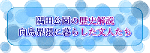 ![]() ![]() ![]() 隅田公園 散策解説板① 江戸時代の墨堤 江戸随一の観光名所 Bokutei in Edo cra-one of the most famous scenic places in Edo 江戸時代以前の墨堤は、牛御前と呼ば れる牛嶋神社に表されるように、放牧 や農業(田畑)を営む地域でした。江戸 時代に入り、三代将軍徳川家光の頃か ら盛んに鷹狩などが行われるようにな り、徐々に江戸の市民に景勝地として 認知されてきました。墨堤の始まりは 、四代将軍徳川家綱の頃の植桜とされ ていますが、実際は八代将軍徳川吉宗 の頃の植桜を期に江戸の花見の名所と して認識され、上野寛永寺・飛鳥山 ・御殿山等とともに江戸の桜の名所 として親しまれました。当時の墨堤 の繁栄の様子は、数多く残されてい る浮世絵や俳句・和歌等によって伝え られています。 Before Edo era, “Bokutei”the banks of the Sumida River, was the area where pasturage and agriculture (fields) were followed as it is clear by Ushijima shrine called “ Ush-gozen” (a sovereign cow) In Edo era falconry etc took place frequently in Bokutei by the third shogun Lemitsu, and gradually the citizens of Edo have recognized it's a scenic place. Although the beginning of “Cherry blossoms in Bokutei”was planted at the time of fourth shogun letsuna, It began to be a famous place to see cherry blossoms whichi were planted more at the time of eight shogun Yoshimune, and was loved as a famous place of cherry trees in Edo as well as Uenokaneii temple, Asukayama, Gotenyama. And so on. The situation of prosperity in Bokutei those days was passed down to now by countless Ukiyoe (Japaness wood block printing), Haiku (Japanese poem), and Waka(Japanese poem). |